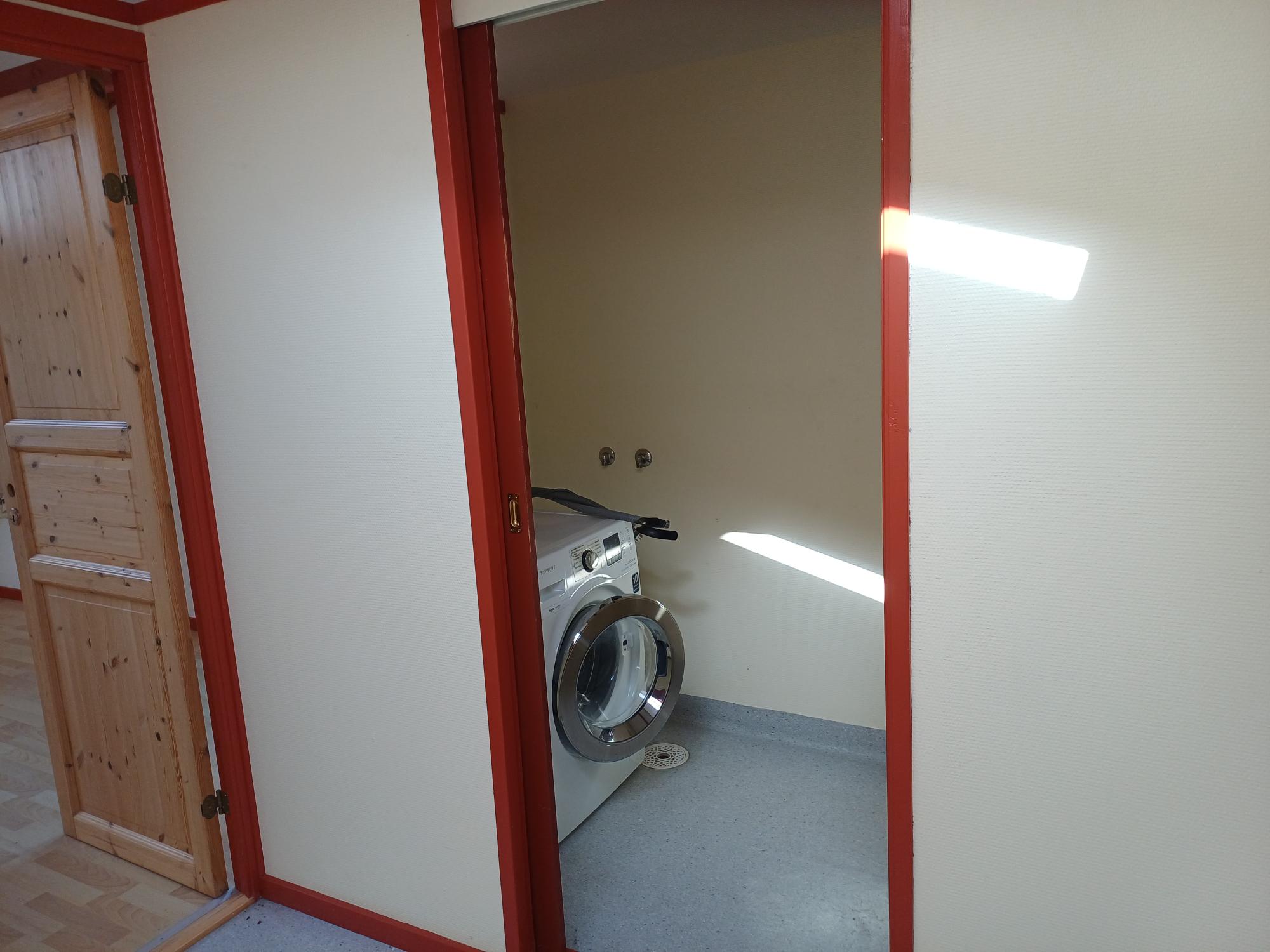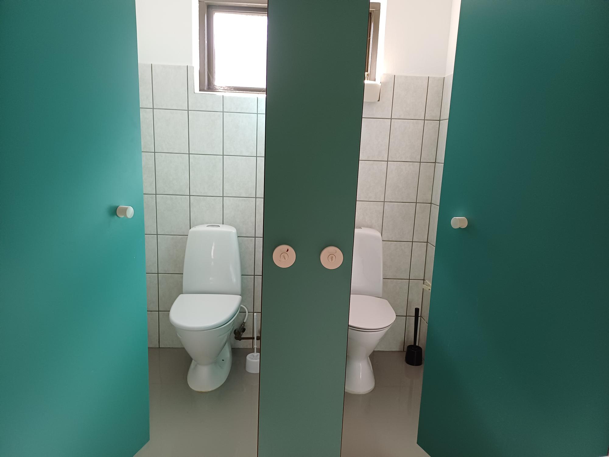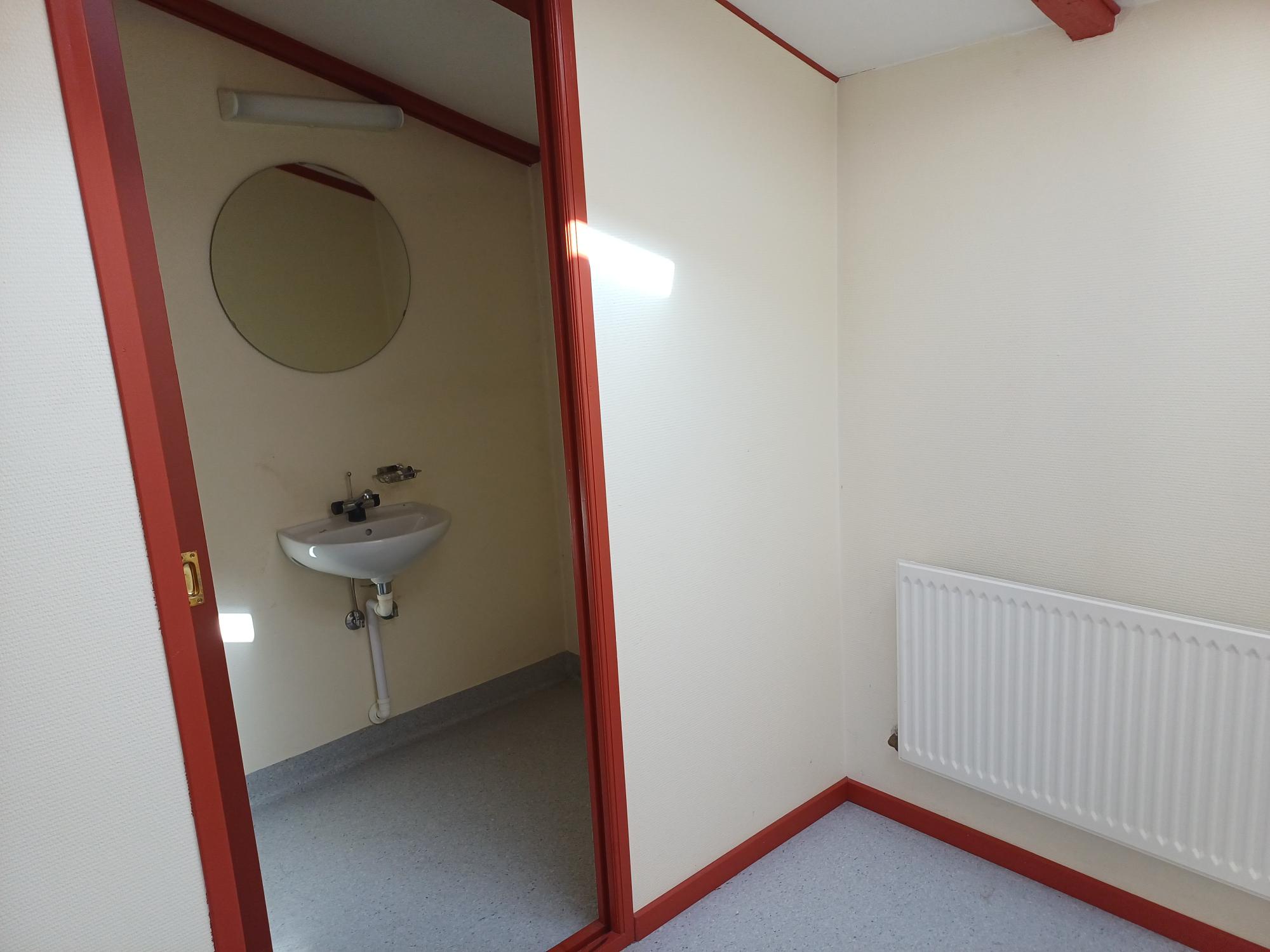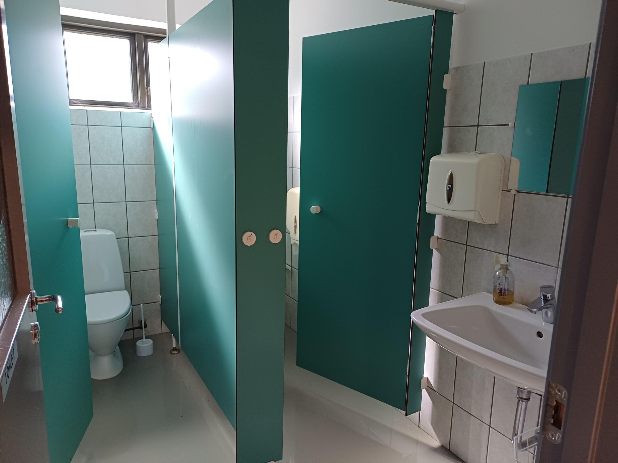 Mellem lagerhal og kontorlokale, er toiletter og håndvask.